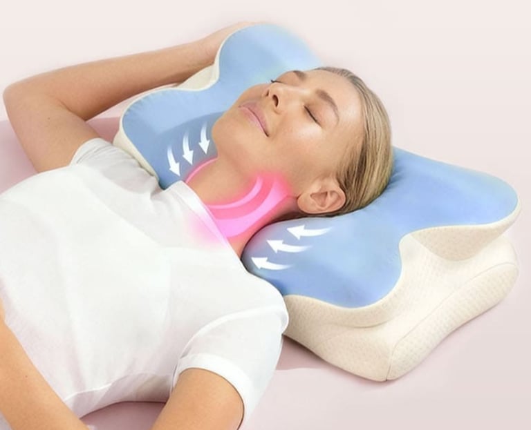 The Melara Max Pillow is an advanced ergonomic memory foam pillow engineered to support the natural curve of your neck, head, and shoulders while promoting proper spinal alignment. Unlike traditional flat pillows that flatten over time or create pressure points, the Melara Max uses a unique “butterfly” or wave-like contour that cradles your head and provides targeted support no matter your sleeping position.